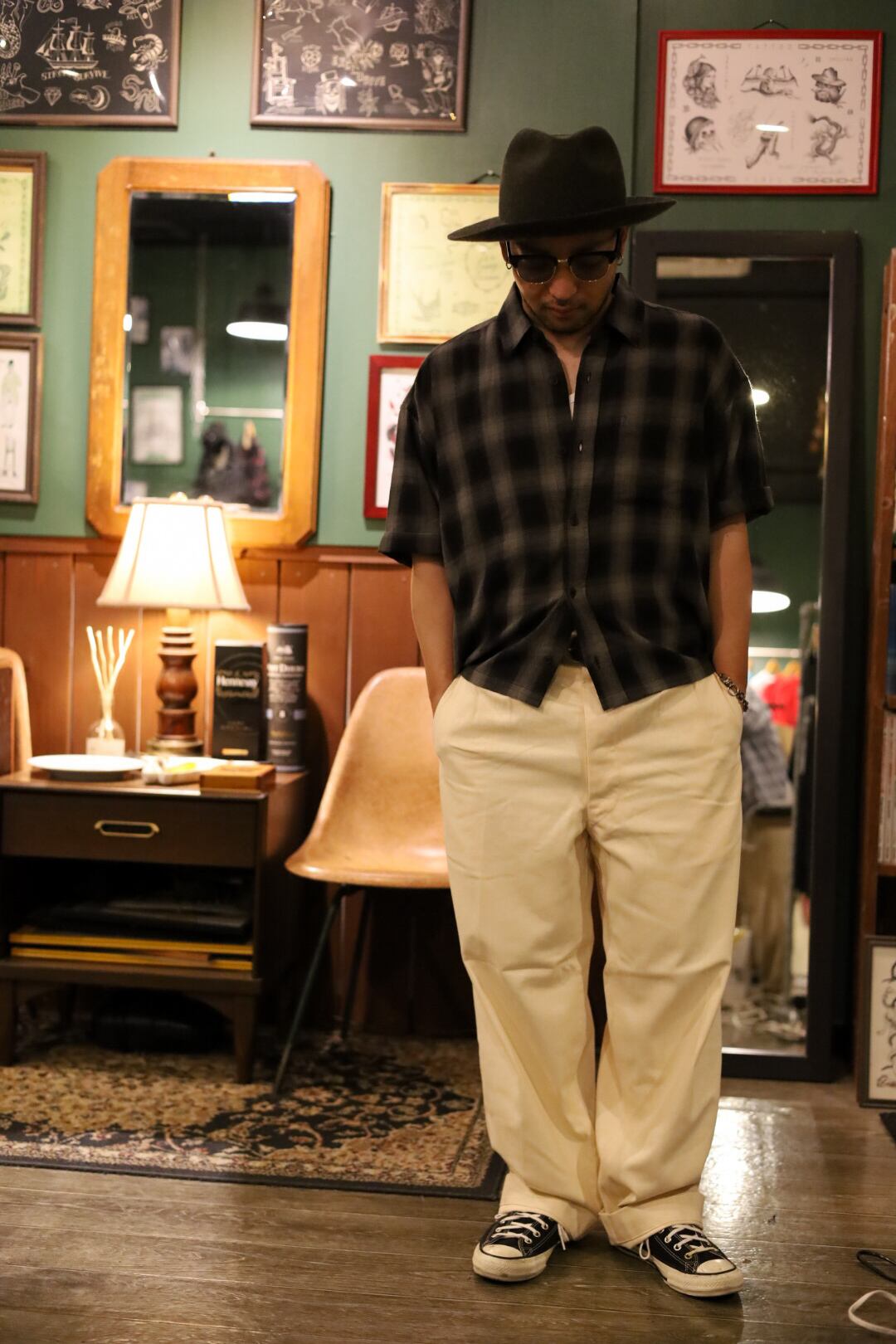 ボトムは正しいウエスト位置でもあるヘソ下で着用。スタイリングを撮影しております。