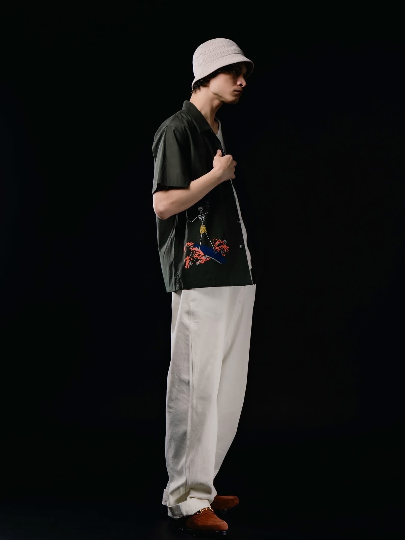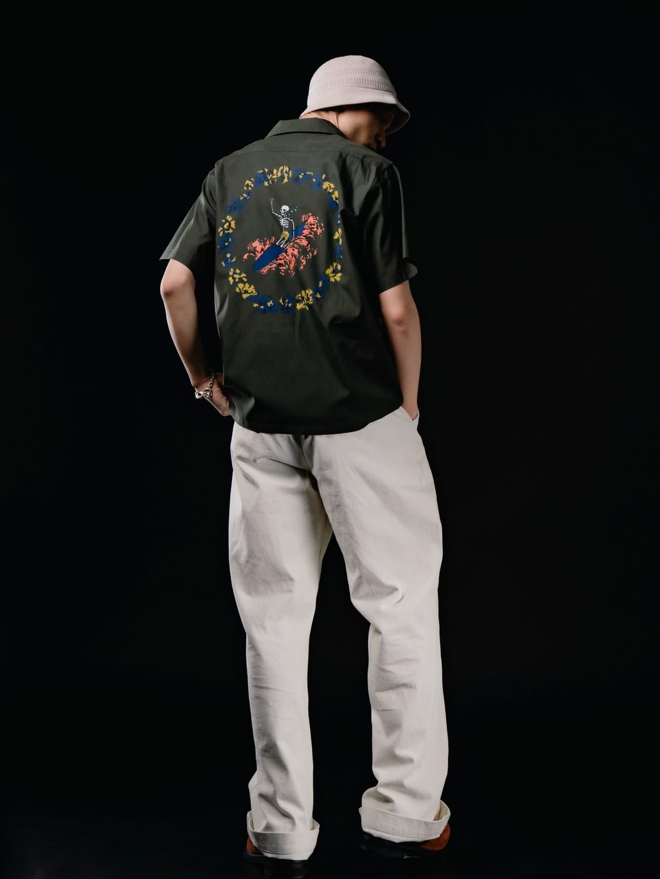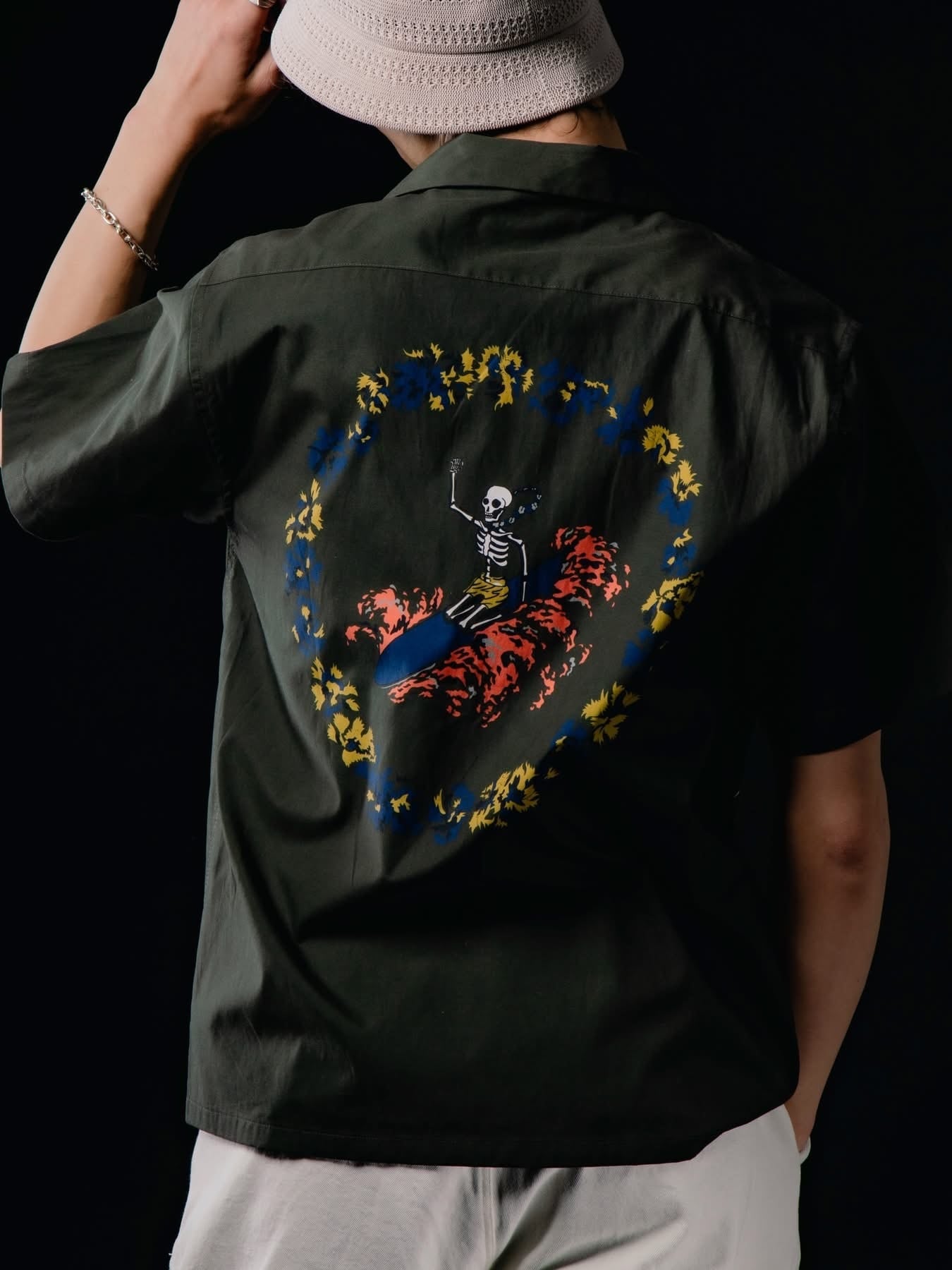 40’sのヴィンテージハワイアンシャツを彷彿とさせる、バックパネルデザインのオープンカラーシャツ。当時のハンドペイントの風合いを表現し、素材には、ドレープ性と通気性を兼ね備えたレーヨン×テンセルの混紡生地を使 用した。 RAYON 55% TENCEL 45% 〈SIZE〉 M 着丈 72㎝ 身幅 60㎝ 肩幅 48㎝ 袖丈 24㎝ L 着丈 73㎝ 身幅 62㎝ 肩幅 50㎝ 袖丈 25㎝ ※多少の誤差はご了承ください。