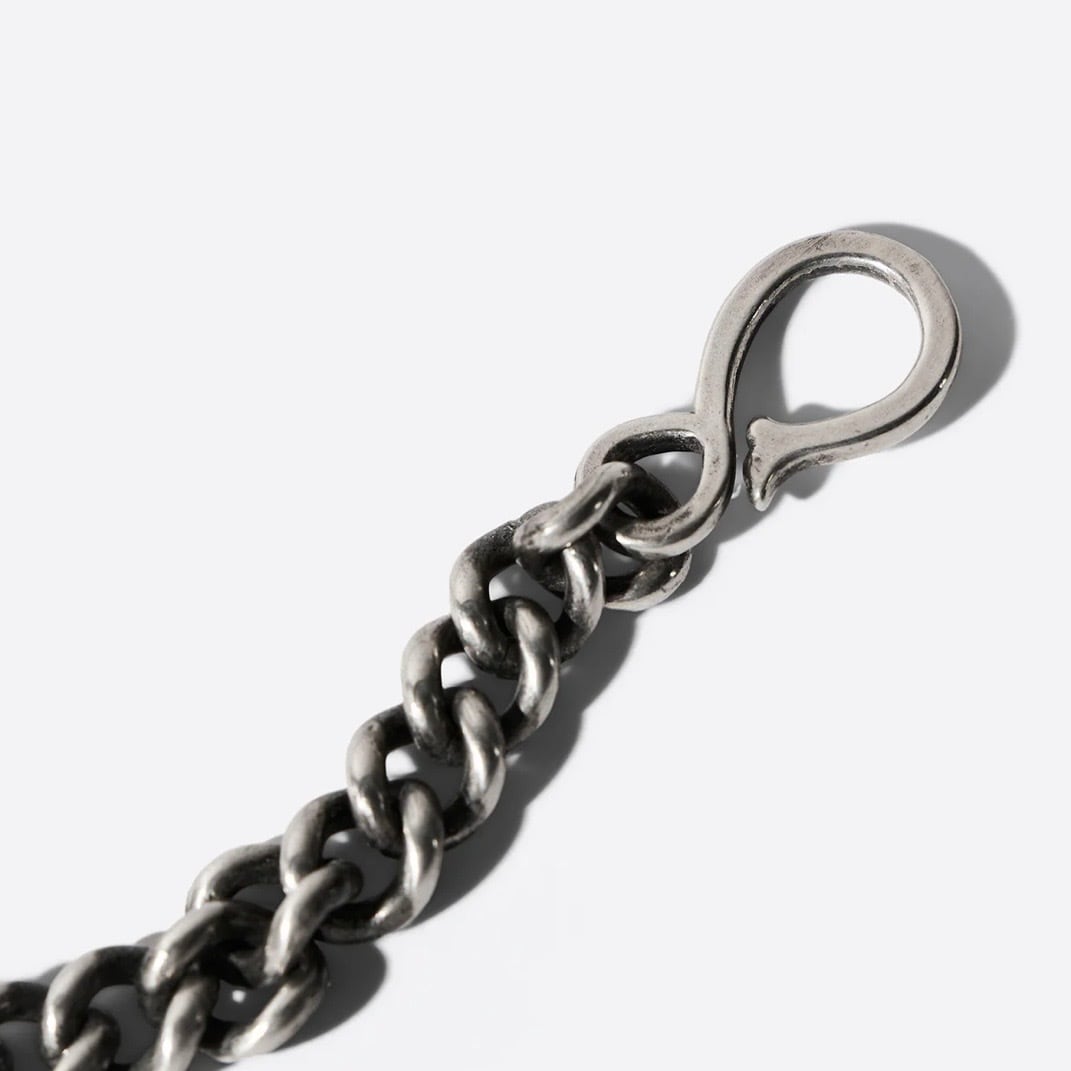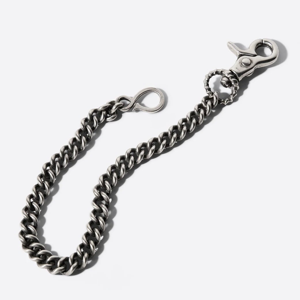 オリジナルで作成したウオレットチェーンです。 他にないCLUCTオリジナルの形が最大の魅力です。 コンパクトながらオリジナリティを発揮してくれる逸品は着こなしの名脇役といえる存在です。 くすみ加工が施されております。 専用ポーチ付き。 CONTENT _BRASS 全長 40cm ※表記サイズはあくまで目安となりますので多少の誤差は生じます。